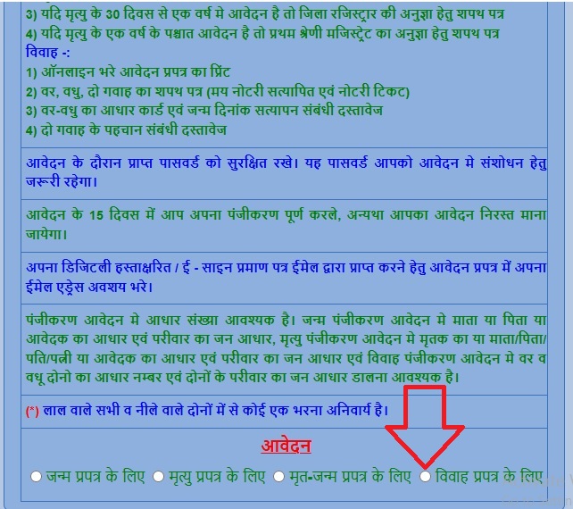 - इसके बाद नया पेज खुलेगा जिसमे निचे की तरफ विवाह प्रपत्र के लिए आप्शन पर क्लिक करना जैसा निचे फोटो में दिखाया गया है